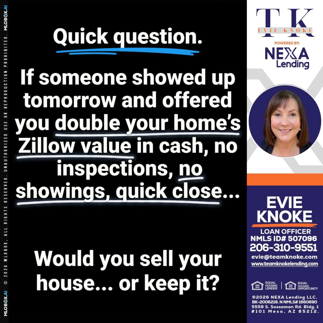 QUICK QUESTION - Evie Knoke -Loan OfficerHi, my name is Evie Knoke. I’m a Loan Officer with NEXA Lending LLC., offering personalized mortgage solutions, fast customized quotes, great rates and service with integrity.