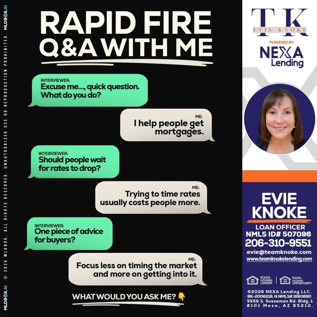 Hi, my name is Evie Knoke. I’m a Loan Officer with NEXA Lending LLC., offering personalized mortgage solutions, fast customized quotes, great rates and service with integrity.